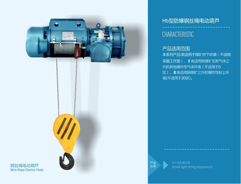 3、 防爆鋼絲繩電動(dòng)葫蘆可與車(chē)間固定懸掛軌道配合單獨(dú)使用,也可與LXB防爆電動(dòng)懸掛單梁、LB防爆電動(dòng)單梁、防爆葫蘆雙梁配套使用。